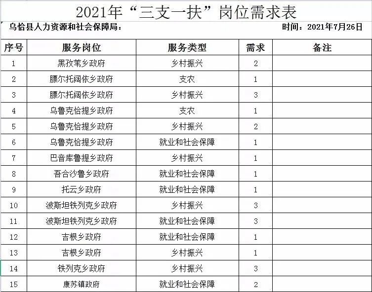 根据《关于实施自治区第四轮高校毕业生“三支一扶”计划的通知》文件要求,2021年乌恰县计划招募26名“三支一扶”高校毕业生。现将有关事项公告如下:
