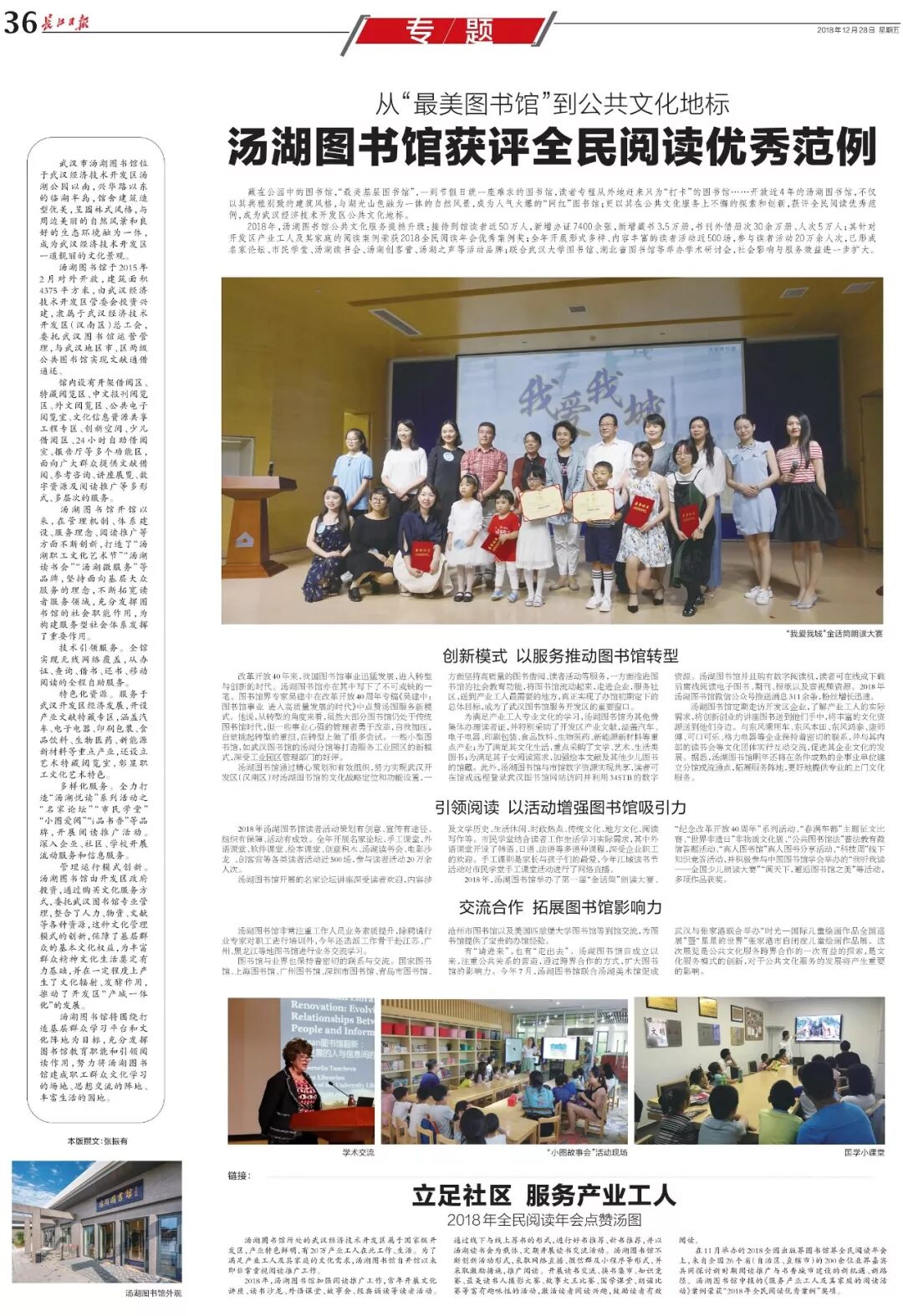 改革开放40年来,我国图书馆事业迅猛发展,进入转型与创新的时代。汤湖图书馆亦在其中写下了不可或缺的一笔。图书馆界专家吴建中在改革开放40周年专稿《吴建中:图书馆事业 进入高质量发展的时代》中点赞汤图服务新模式。他说,从转型的角度来看,虽然大部分图书馆仍处于传统图书馆时代,但一些事业心强的管理者勇于改革,自我加压,自觉挑起转型的重担,在转型上做了很多尝试。一些小型图书馆,如武汉图书馆的汤湖分馆等打造服务工业园区的新模式,深受工业园区管理部门的好评。