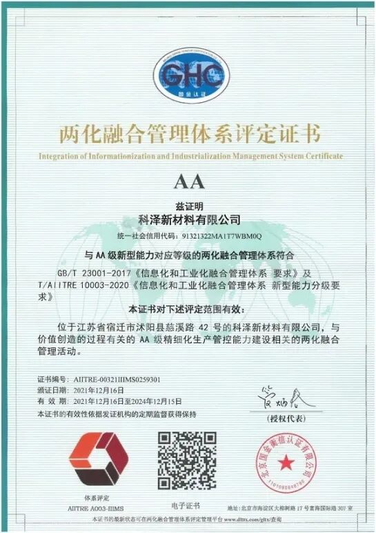近日,科泽新材料有限公司成功荣获“两化融合管理体系”AA级认证,本次贯标认证的顺利通过,标志着科泽新材信息化与工业化深度融合方面取得了新的突破,助力科泽新材高端化、国际化发展奠定了坚实基础。