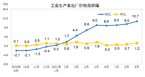 宏观数据显示的情况也是如此。国家统计局9月数据,工业生产者出厂价格(PPI)同比上涨10.7%,环比上涨1.2%,创有数据记录以来的新高,高于市场预期的10.5%。但全国居民消费价格(CPI)当月同比上涨0.7%,略低于市场预期的0.8%,环比持平,同比上涨0.6%。
