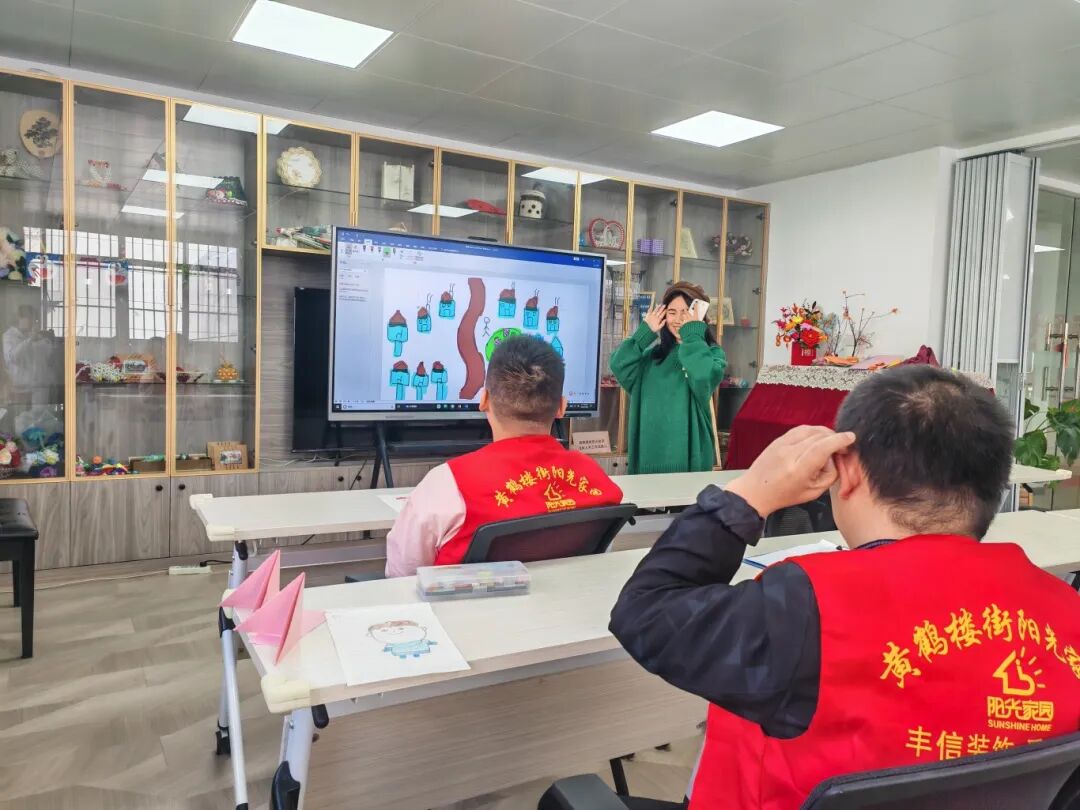 课程伊始,志愿者引导学员们认识自我肖像,通过辨识脸型、发型和五官特征,为学员们开启认识自我的新窗口。随后,志愿者带领学员们共同演唱《阳光总在风雨后》等励志歌曲。面对歌曲中的难点,志愿者们逐字逐句地耐心指导,确保每一位学员都能跟上节奏,沉浸其中。课程尾声,志愿者们采用图文并茂的生动方式,展现诗歌意境,并带领学员们集体朗诵,为本次活动画上了一个圆满而充满诗意的句号。