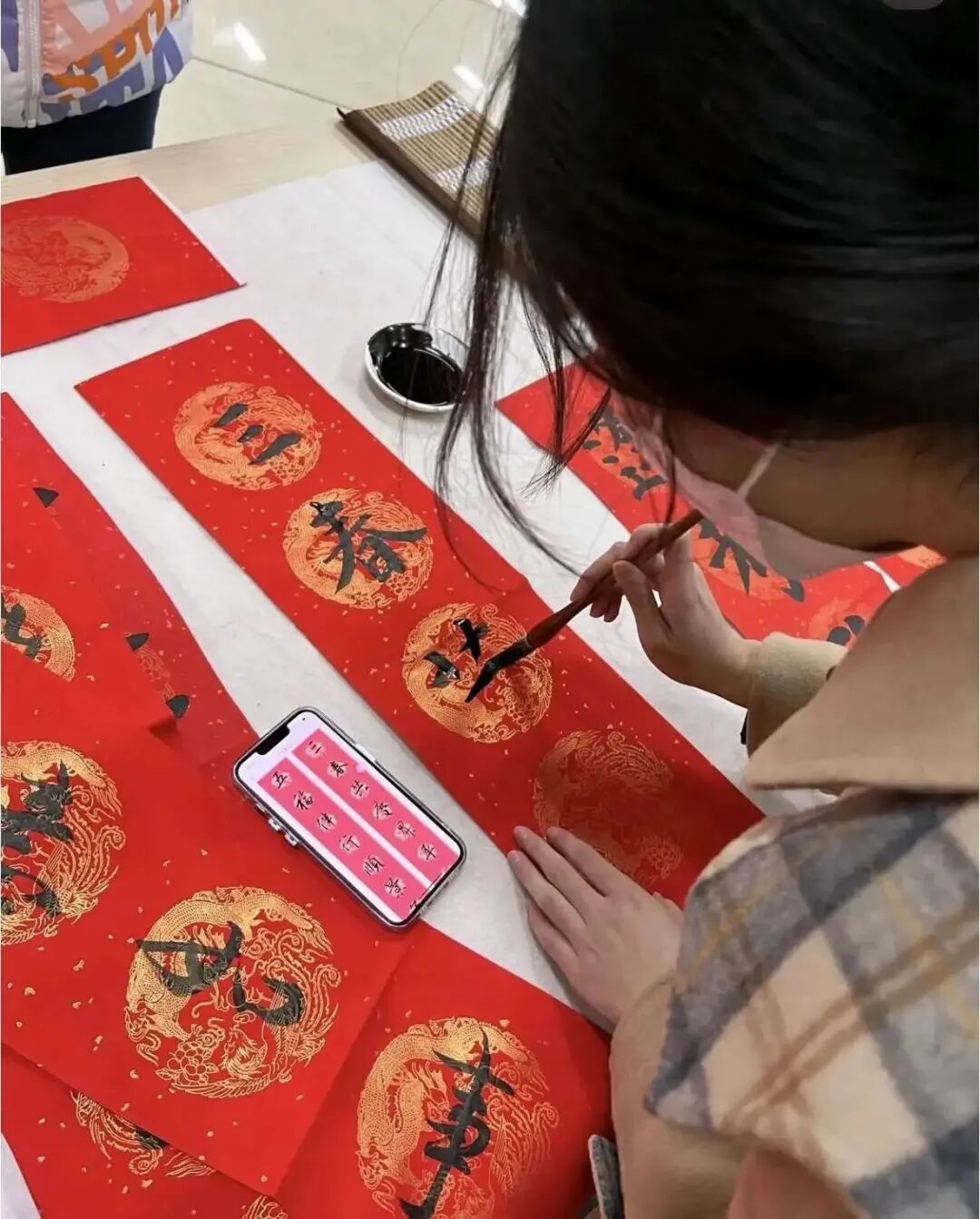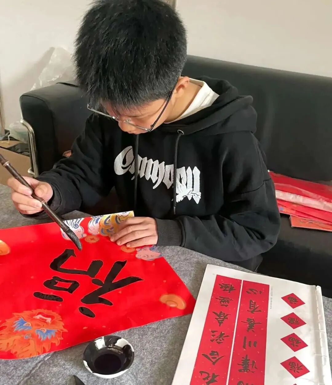 文意互通情谊深,神韵相契墨香浓。写春联活动中,大学生志愿者与小朋友合作完成了一副对联的书写。志愿者和小朋友不仅仅创作了一副对联,更重要的是建立了深厚的情感纽带。