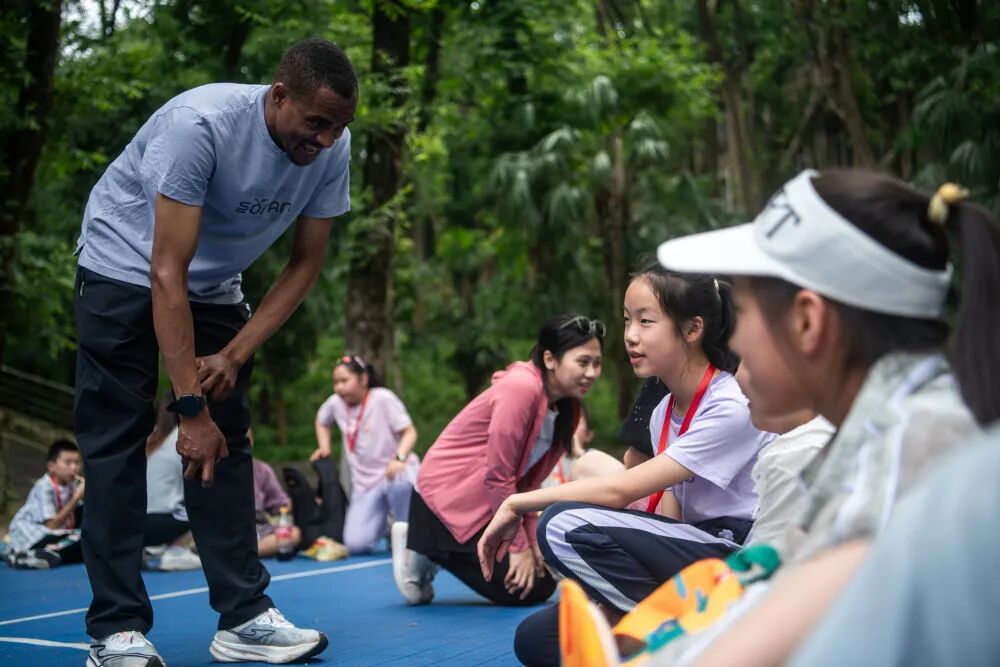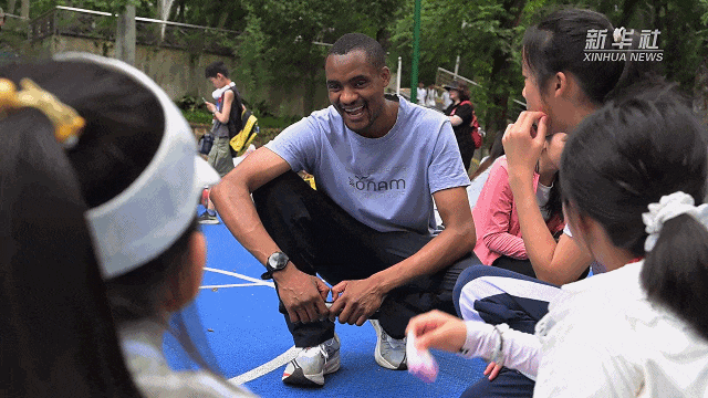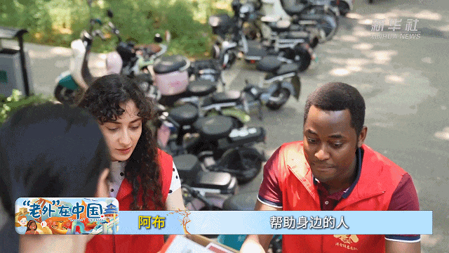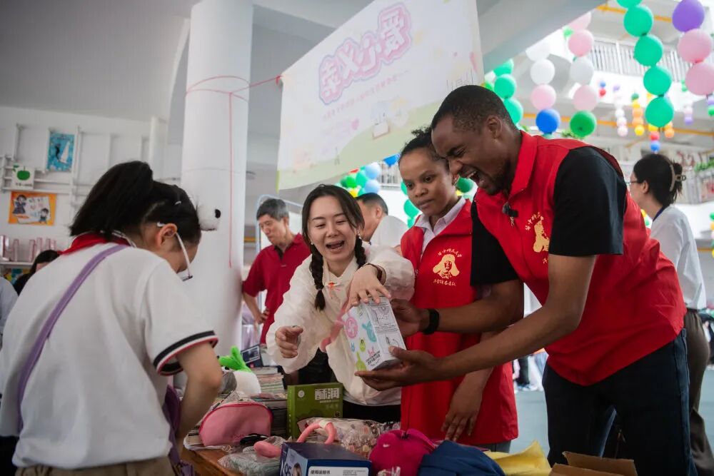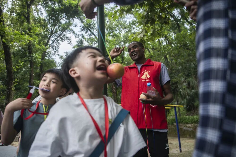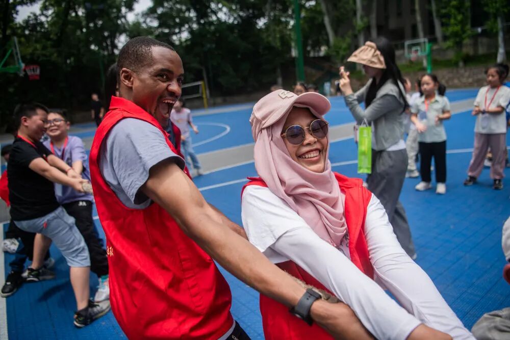 阿布(前左)在志愿活动中和小朋友们一起拔河