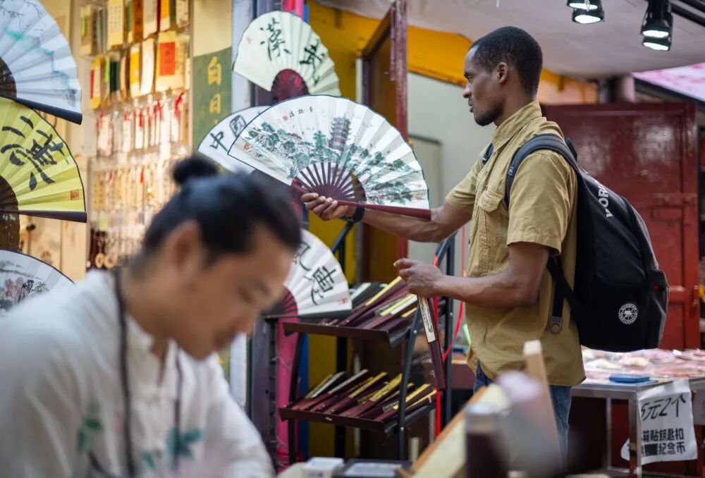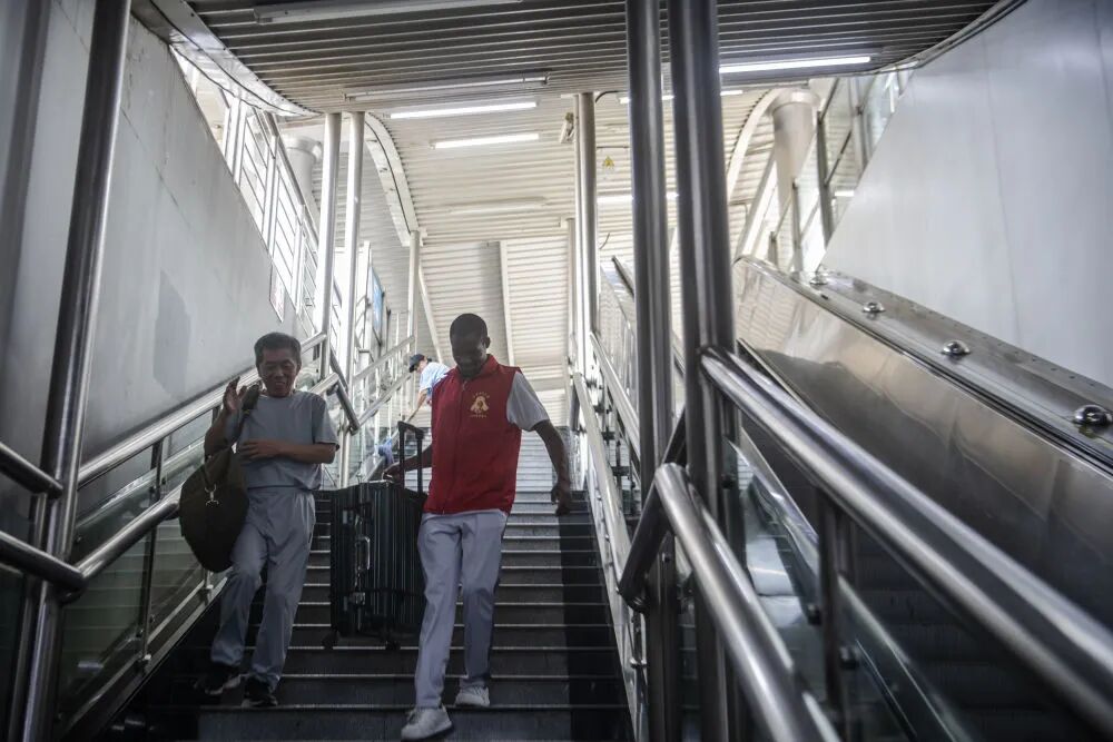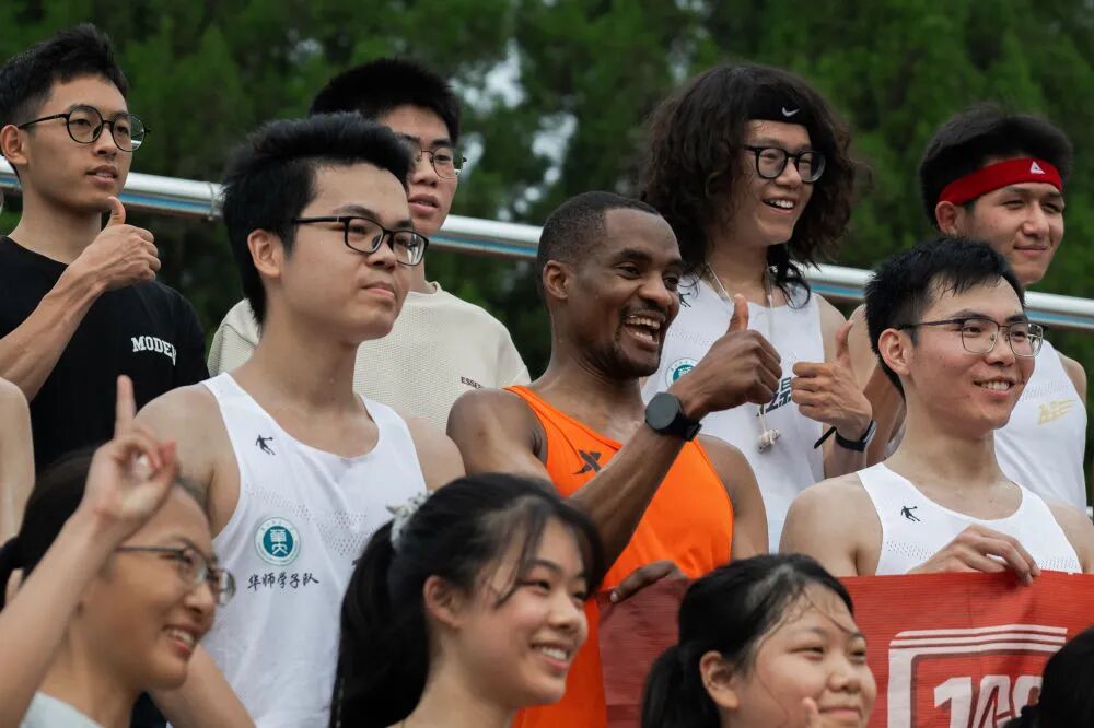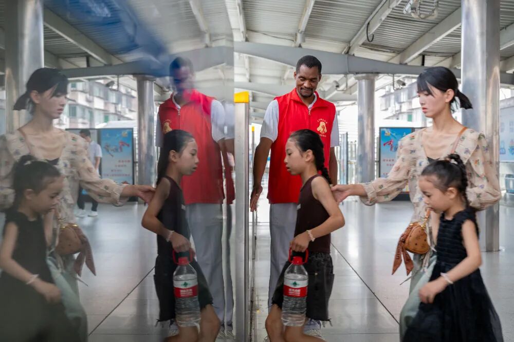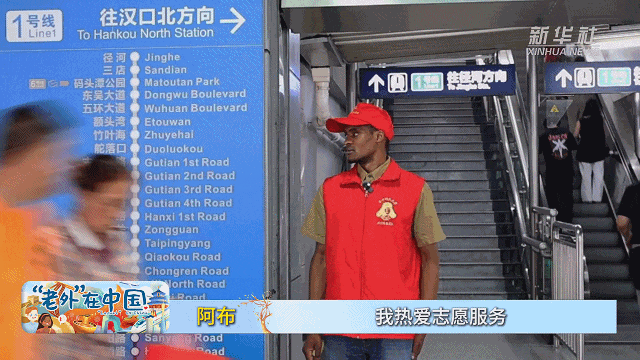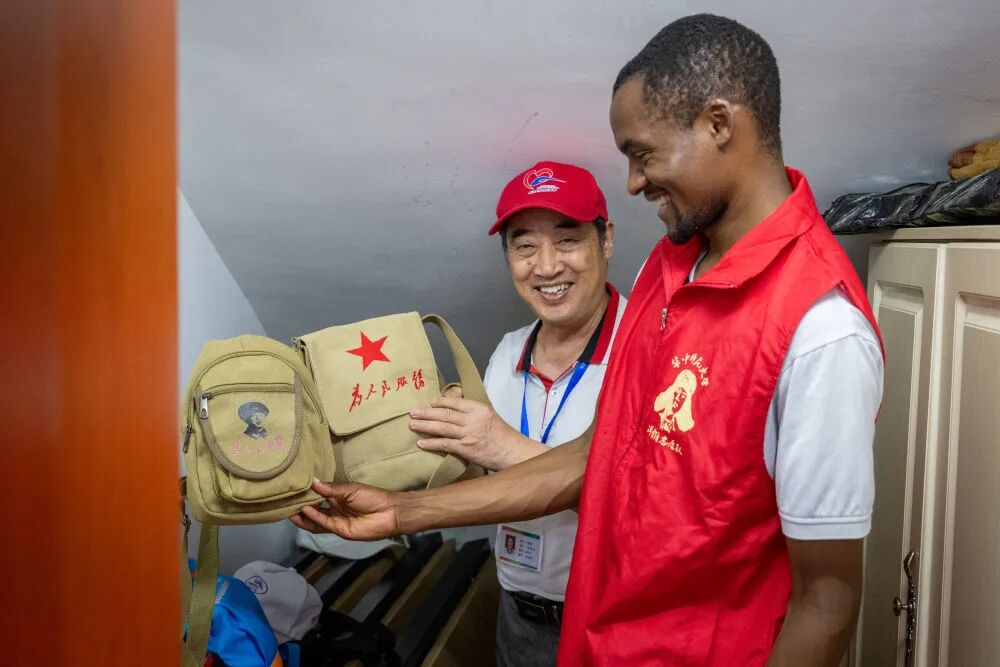 阿布(前左)在志愿活动中和小朋友们一起拔河