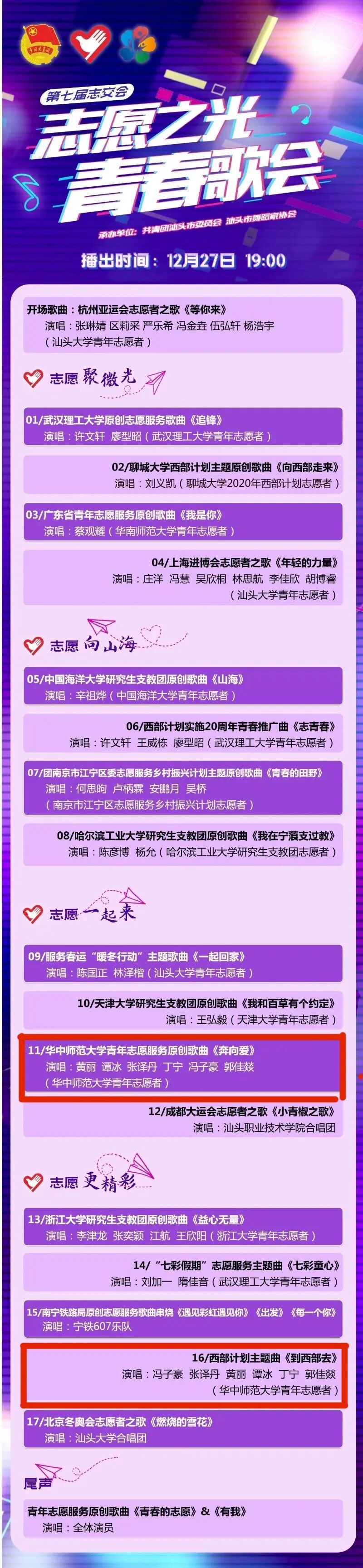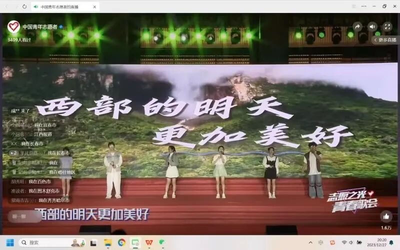 近日,第七届志交会“志愿之光”青春歌会在汕头大学桑浦山校区大礼堂前广场线下举行,并于12月27日正式于中国青年志愿者官方视频号直播间火热开唱!我校音乐学院志愿者黄丽、谭冰、冯子豪、张译丹、郭佳燚、丁宁6位同学在学校许曾老师指导下,积极参加本届“志愿之光”青春歌会,激情唱响《奔向爱》和《到西部去》两首歌曲。据统计,累计近1.7万人次线上观看本场直播,节目点赞量近1.8万。