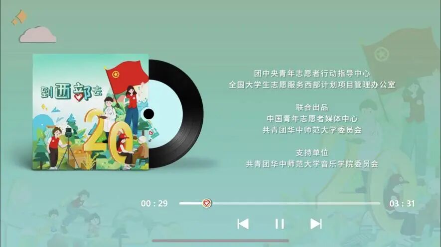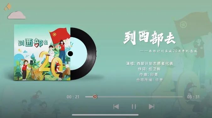 为致敬大学生志愿服务西部计划实施20周年,由团中央青年志愿者行动指导中心、全国大学生志愿服务西部计划项目管理办公室出品,中国青年志愿者媒体中心、共青团华中师范大学委员会联合出品的大学生志愿服务西部计划主题曲《到西部去》(20周年纪念版)火热上线,并受到了广大西部计划志愿者的关注。