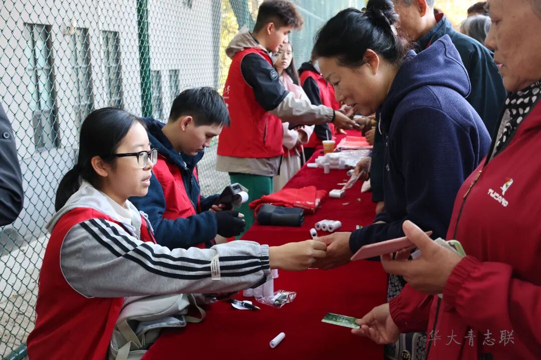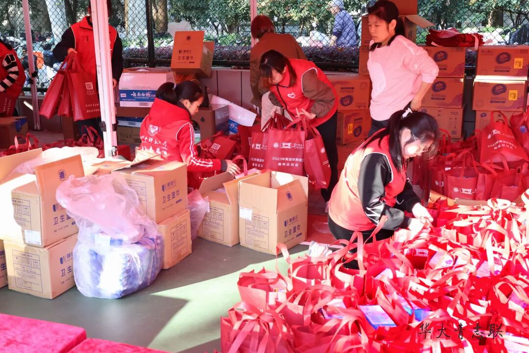 运动会开始前,发票领奖组部分志愿者在工作人员的指导下包装奖品,将牙膏、纸巾等奖品包装在印有“华师”logo的编织袋中。组内其他志愿者在一卡通领票处,耐心回答离退休教职工的问题,并发放票券。