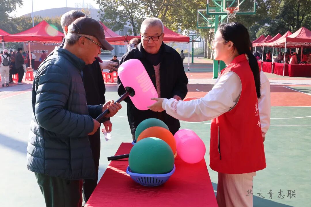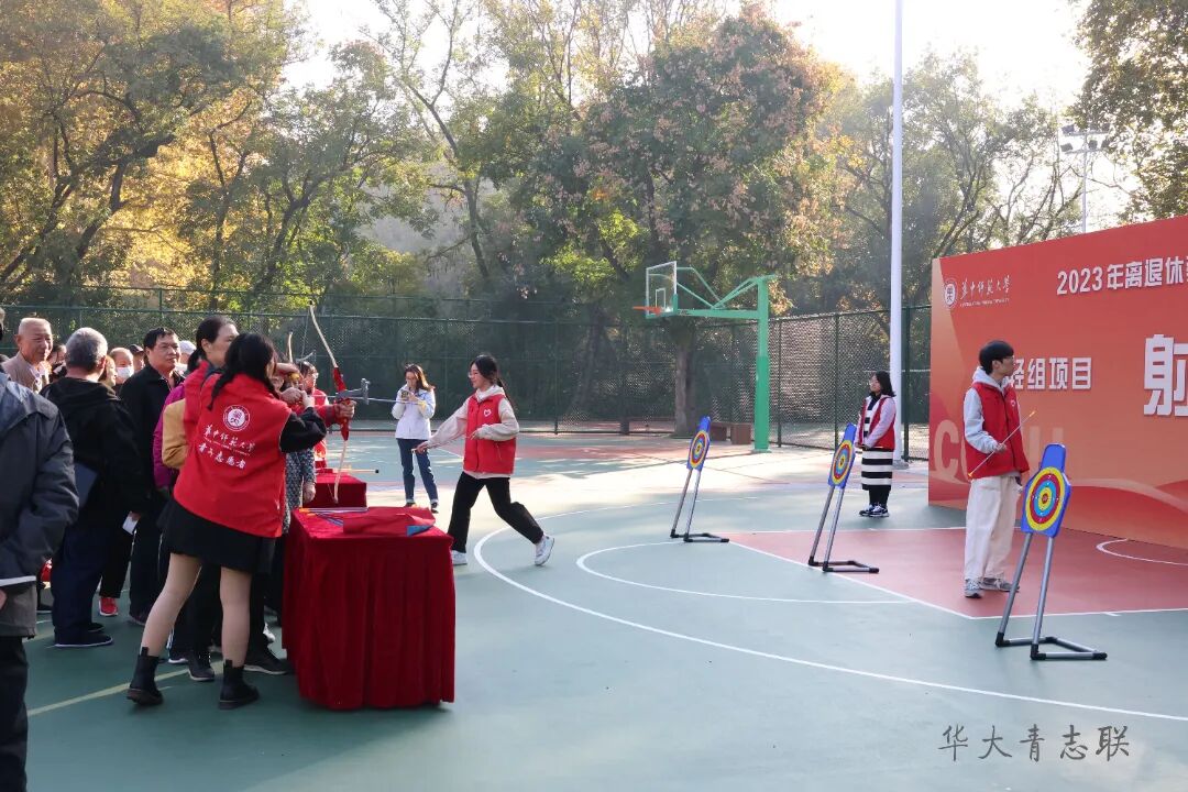 当离退休教职工到达投球、门球等活动地点时,志愿者们耐心地向他们解释活动规则,并做出示范,指导他们练习运动项目。在技巧性比较强的射箭项目中,志愿者们认真负责,积极与离退休教职工互动,不断鼓励和引导他们做出正确的射击动作。欢声笑语不断,朝阳相伴,微风依旧,整个篮球场洋溢着欢乐的氛围。