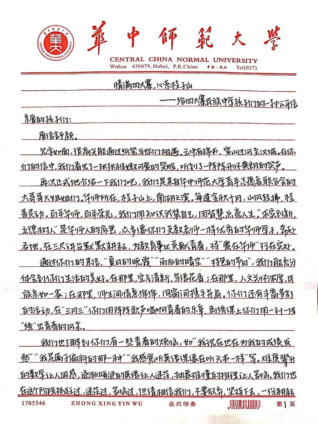 值得一提的是,与志愿者回信一同寄出的还有两封来自青志联特殊的公开信,分别是《爱洒他山,情暖华师——给他山中学孩子们的一封公开信》和《情满四大寨,心系桂子山——给四大寨民族中学孩子们的一封公开信》。这两封公开信中,志愿者表达了对孩子们深情的关怀和殷切的期望,并给予孩子们真诚的建议和鼓励。