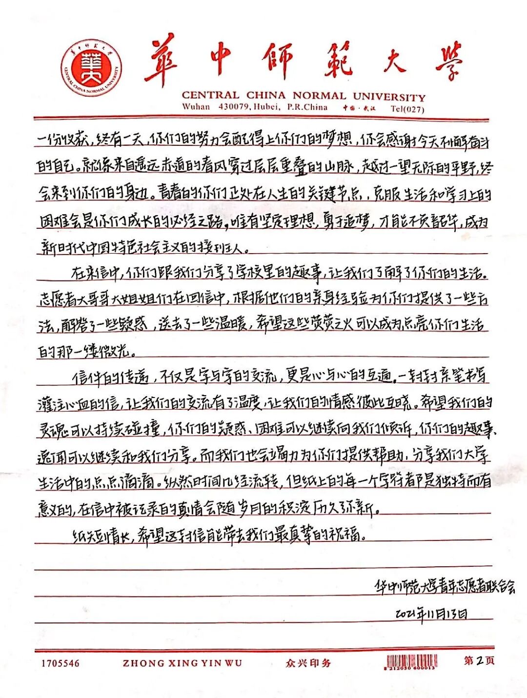 在如今快节奏的社会中,我们以书信这种传统的“慢”方式遥寄心中所想,用文字传递温暖的鼓励,构建心灵交流的桥梁。希望在未来的日子里,我能够与结对的孩子共同成长,成为她的倾听者,为她排忧解难,引导她形成阳光、健康、向上的生活态度,照亮她青春懵懂的心灵。