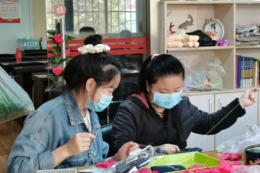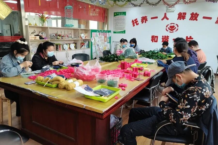而在另一边,有过一定刺绣经验的志愿者刘伍秀也开始帮助残障朋友进行茶垫刺绣。她主动为其讲解与示范,让残障朋友对刺绣产生了极大的兴趣。在手工制作之余,刘伍秀还和残障朋友交流起了“家乡”这一话题。她热情地介绍了自己的家乡,并比较了其与武汉风土人情的不同。对于她的分享,残障朋友认真倾听,并作出了积极的回应。虽然只是第一次见面,但志愿者都已被残障朋友的热情和认真所打动,其中一位残障朋友还主动揽下了所有的穿针任务,为伙伴们解决了一个大难题,引得活动室里欢笑连连。