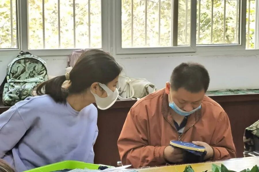 在刺绣过程中,志愿者和残障朋友们由陌生逐渐到熟悉,共同体验手工活动的独特乐趣。其中,志愿者韩钰娇耐心陪同在一位残障朋友身边,帮助其解决了穿针和理线的小难题。在韩钰娇的引导帮助下,残障朋友开始尝试自己动手进行刺绣,两人也在不断的配合中建立起了熟悉感。尽管对于部分残障朋友而言,手工刺绣的任务有些许困难,但志愿者的帮助和陪伴都给予了他们极大的鼓励,整个活动现场氛围融洽,笑语不断。