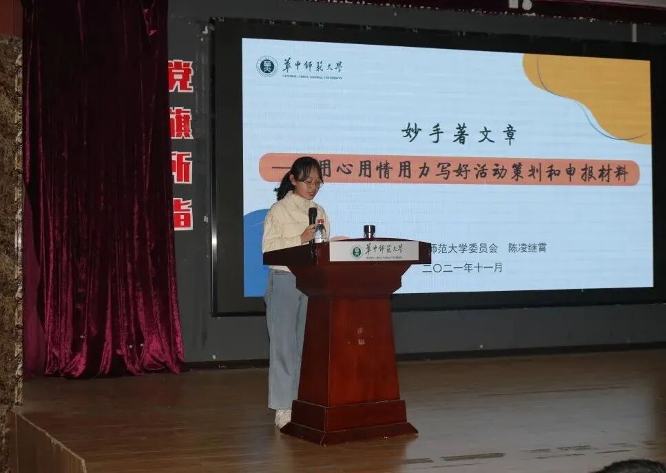 在大家的掌声中,陈凌继霄开始本次培训。本次培训题为“妙手著文章”。对于活动策划和申报材料写法,陈凌继霄从用心构思“金点子”、用情策划“新路子”、用力组织“新法子”三个方面对活动策划和申报材料撰写展开讲解。
