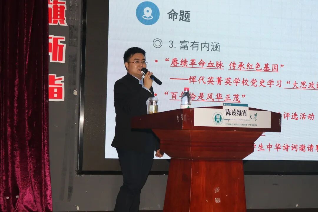 在第一部分。陈凌继霄强调选题要注意紧跟党的部署,聚焦时事热点,围绕中心大局和结合工作实际,注重“时效”和“实效”。他结合即将到来的党的二十大与中国共产主义青年团成立100周年两大具体实际展开讲解。陈凌继霄提到,命题要注意凸显主题、主附一致、富有内涵并且朗朗上口。“主标题貌美,副标题如花”,陈老师风趣幽默的话语为培训增添了许多乐趣。
