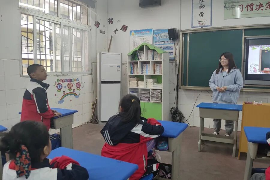 志愿者薛皓月在与学生互动