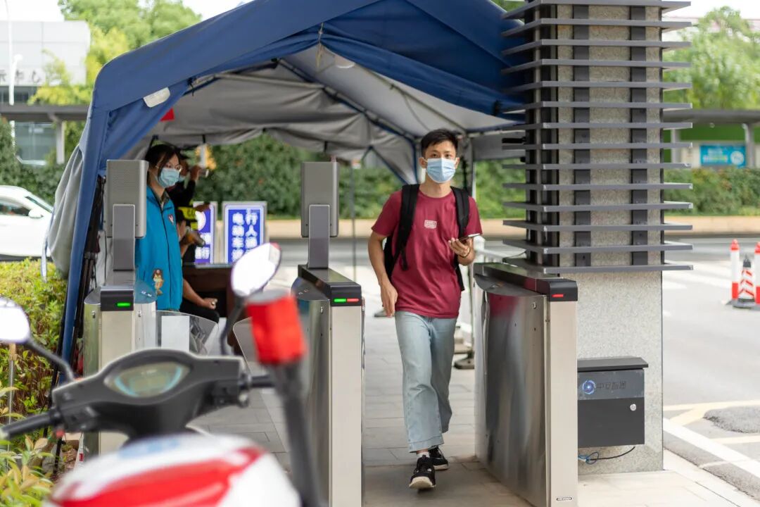 引导同学扫码登记后刷校园卡进入校门