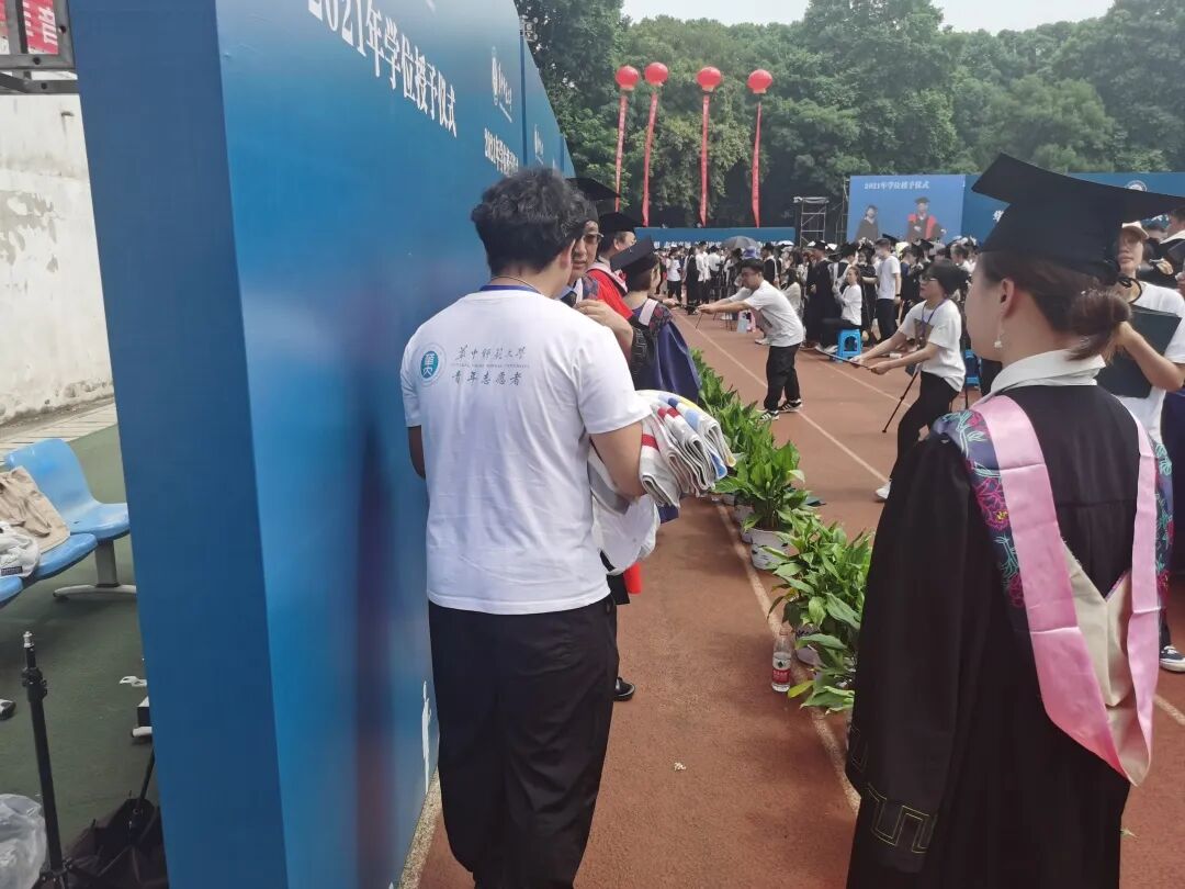 6月13日,华中师范大学2021届毕业典礼暨学位授予仪式在佑铭体育馆隆重举行。8950名2021届毕业生,2234名重返校园2020届同学以及3024名家长,共同出席我校史上最大规模的毕业典礼,共襄盛举。在欢庆毕业典礼之余,华师青年志愿者们也各司其职认真履行好责任,如:测量人员体温,维持会场秩序,搬运清点物资等。在志愿服务实践中,青年志愿者们发挥着生力军的作用,进一步弘扬“爱在华师”的校园志愿服务文化氛围。