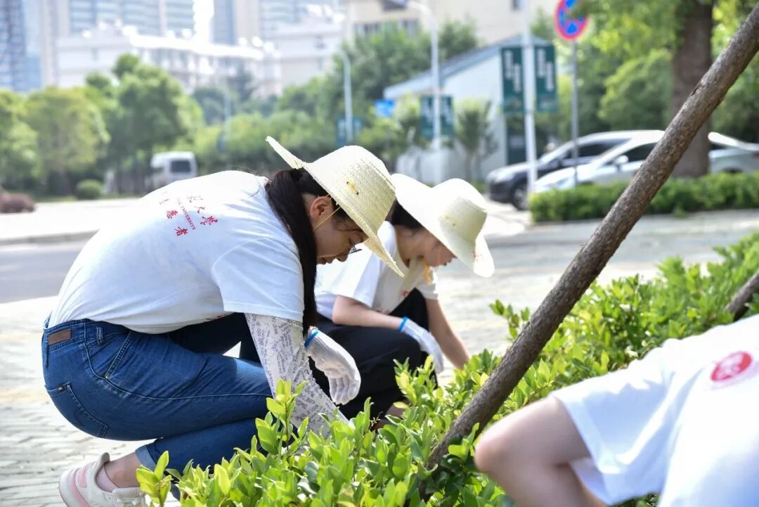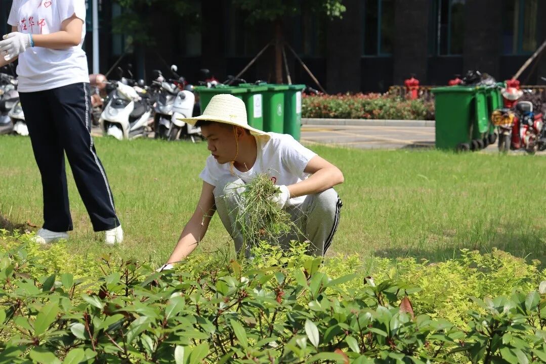 随后,志愿者们领取草帽、手套等工具,分为八个小组,在园林科师傅带队指挥下,进入相应区域进行除草工作。在炽热的骄阳下,志愿者们深入草坪,不畏辛苦、不惧虫咬,将杂草从草坪、树丛中清除。虽然头上是炎炎烈日,志愿者们的衣服也都被汗水浸透,但经过一个多小时的努力,经过一次次的弯腰起身,志愿者们将南湖校区综合楼附近的杂草基本清除干净。