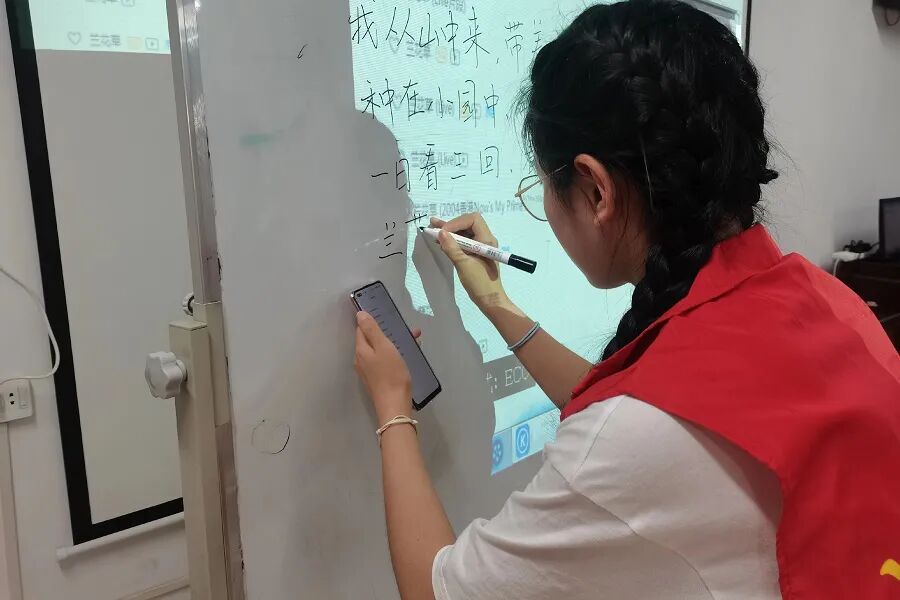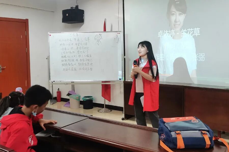 活动当日,为保证活动顺利进行,志愿者们提前到达指定地点集合,乘车前往社区。在完成志愿者签到、换上志愿者专属马甲等准备工作后,志愿者们在社区相关工作人员的带领下进入教室与小朋友们问好。等小朋友们逐渐安静下来后,两位志愿者开始进行自我介绍。在简短的自我介绍结束后,志愿者开始播放今天要教学的歌曲——《兰花草》。