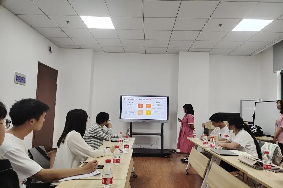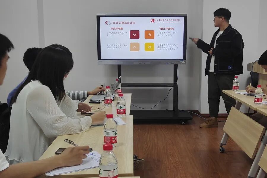 活动中,公管青协成员对公管青协的现状与问题进行了阐述。首先,王丁川介绍了公管青协的发展情况。对于公管青协的组织建设、机构运营、成员分工进行了详细的说明;然后,胡杨从常规活动和特色活动两方面介绍了公管青协的活动开展情况。其中,常规活动主要包括社区四点半课堂和循礼门地铁站志愿服务,特色活动主要培养典型是河湖之友。最后由徐硕总结在展开志愿活动时遇到的问题和困难。