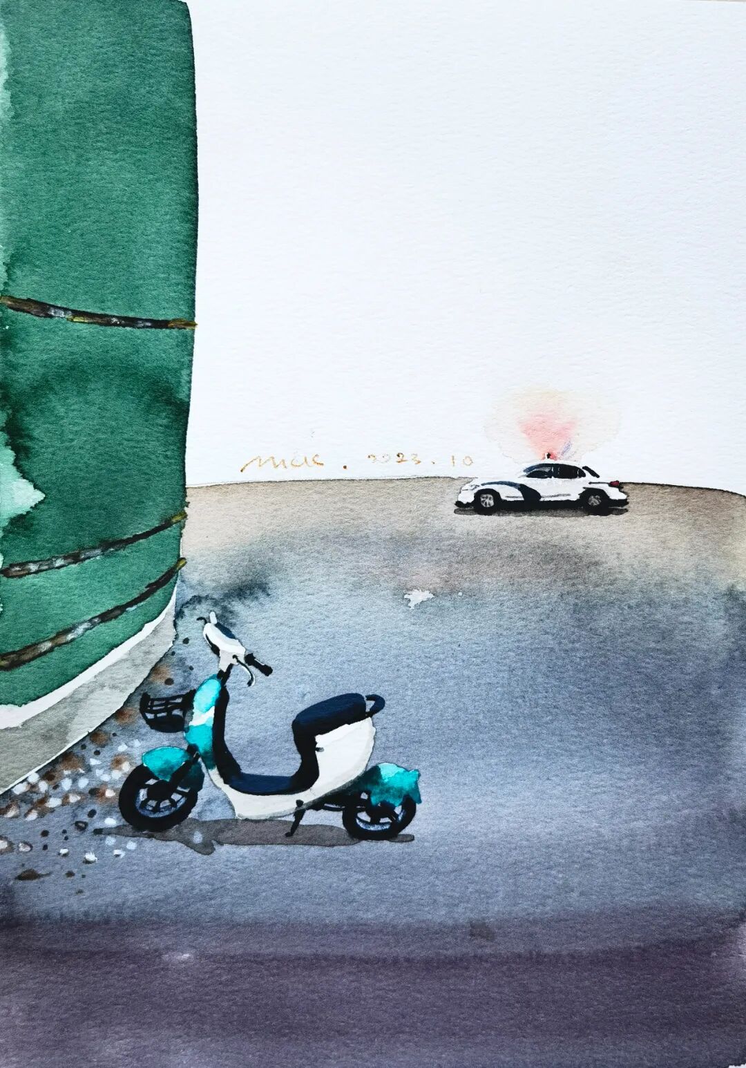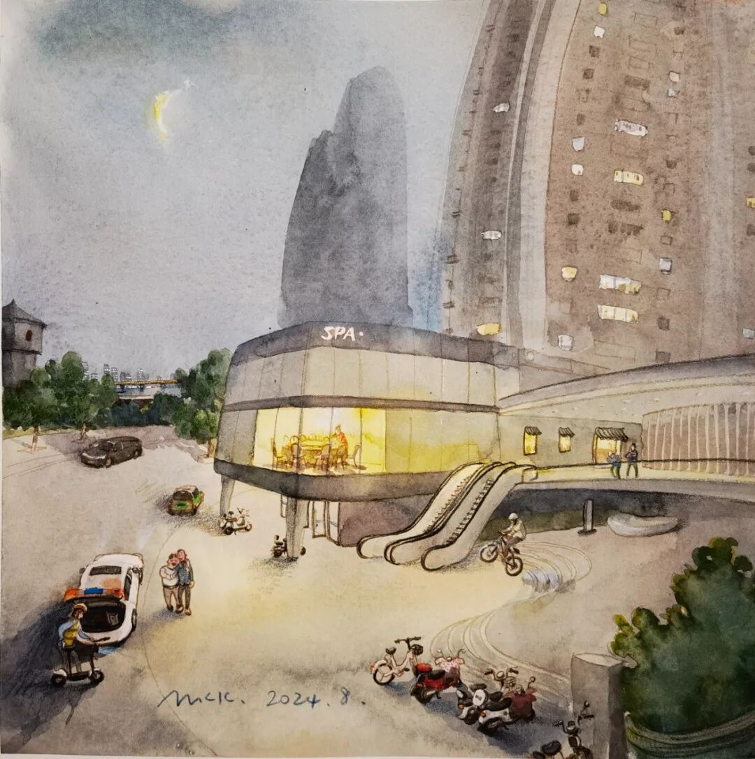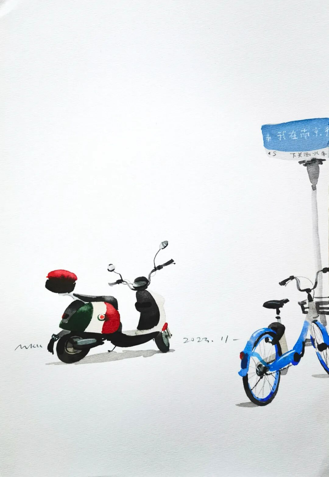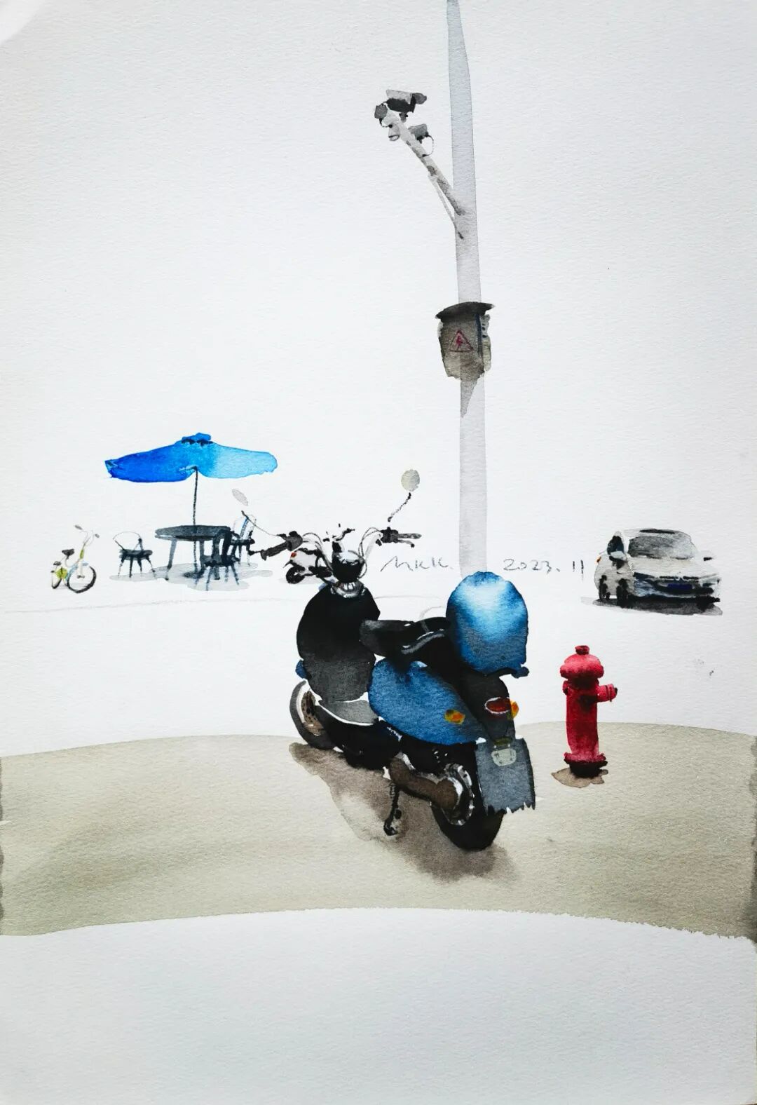 •【未来世界】小时候最爱的小人书是《小灵通漫游未来世界》,我憧憬着在长大后拥有一辆自动驾驶的喷气式汽车和一个可以视频通话的小盒子。现在的我生活在南京,对于小时候的我来说,这个城市的每一个角落都是真正的“未来世界”的样子。有时候我会凭借记忆去把我熟悉的地方画下来,有时候我会跟朋友去街头写生,这些小画中蕴藏了当下的我与我爱的人们生活的线索,我很想把这些小画献给三十年前的自己,让那个少年看看未来真正的模样。(2024)