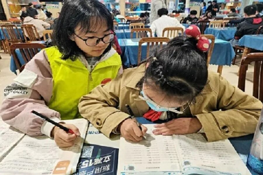 志愿者辅导小朋友完成数学作业