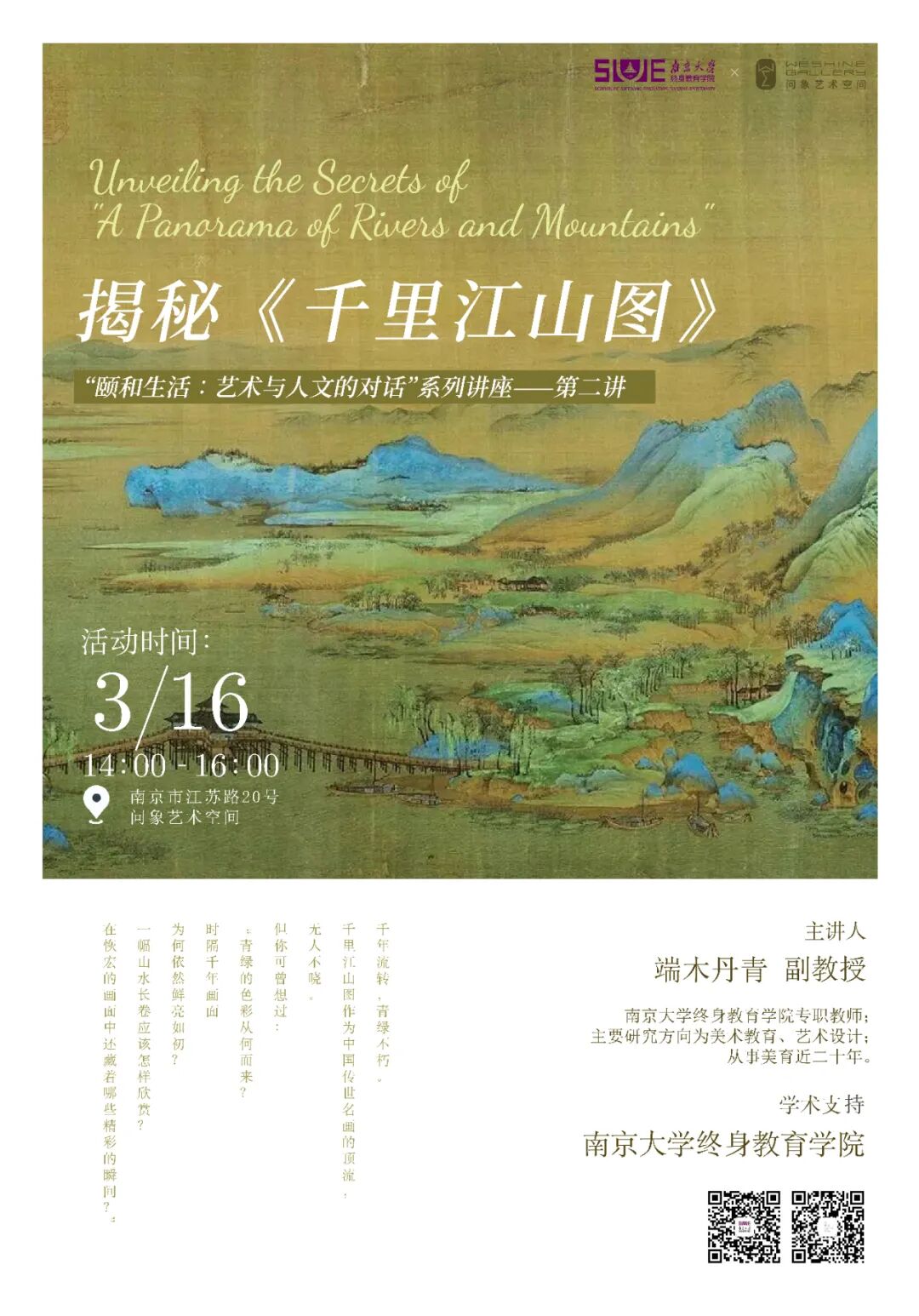 千年流转,青绿不朽。2025年3月16日下午14:00,“颐和生活:艺术与人文的对话”系列讲座第二讲——揭秘《千里江山图》在问象艺术空间(颐和馆)圆满举办。本次讲座邀请到副教授、南京大学终身教育学院专职教师端木丹青老师主讲,她带领观众沉浸式欣赏这幅山水长卷,一同领略它的前世今生。