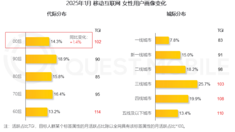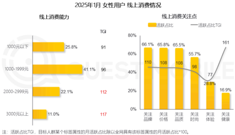 全网女性用户中00后、90后、80后占比近五成,00后作为新兴的消费群体,其比例同比增长1.4%;在城际分布上,女性中下沉用户比例近六成,消费观念的升级使其成为主力军数据显示,移动互联网应用的适老化改造升级,提升了银发女性的触网体验。相比全网,女性用户中60后银发群体活跃占比凸显。女性线上高消费能力凸显;伴随着消费多元化,女性对于品牌、价格、品质更加敏锐,健康理念的提升,女性对健康相关产品与服务更为重视。