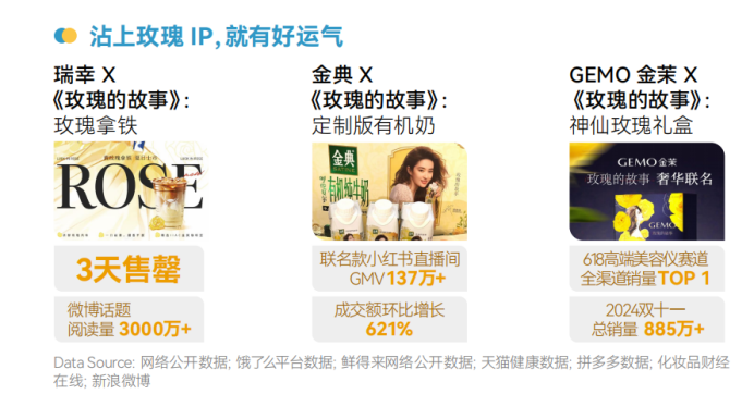 当文化 IP 与热梗的巧妙结合,成为了引爆情绪消费的又一强大力量。瑞幸联名《玫瑰的故事》推出玫瑰拿铁,借助热门影视作品的影响力和话题性,成功吸引了大量消费者的关注,消费者借此表达个性、获得认同。文创周边与热梗结合,赋予产品文化符号与情感记忆,成为有收藏价值的情感载体,激发消费热潮。