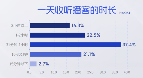 >>>近4成的听众一天收听播客超过1小时,相当于1集长综艺或近2集电视剧。