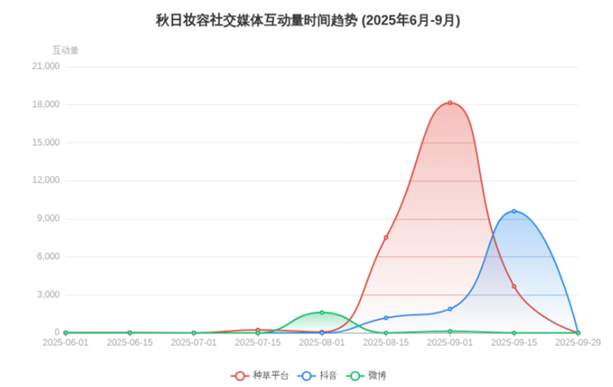 2025年秋日美妆市场,热度随季节脚步稳步攀升。社交媒体数据显示,6-7月“秋日妆容”声量普遍处于低位,8月起显著攀升,9月达到顶峰,与消费者“换季换妆”的需求高度同步。不同平台则分工明确:种草平台以专业内容属性贡献76.49%的声量,成为妆容教程主阵地;抖音凭借短视频爆发力,用18.13%的声量撬动74.85%的互动量,9月22日单日互动量更是高达110195,成话题引爆关键。