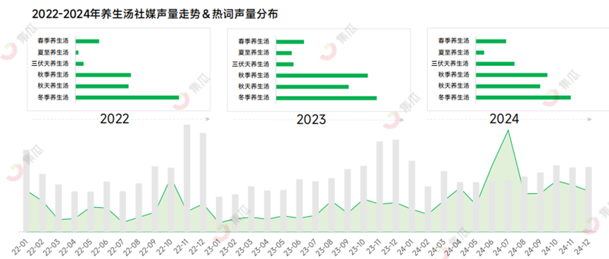 秋日“滋阴润燥”的需求,让养生市场转向“便捷化、场景化”。饮食上,秋季养生汤热度飙升,2024年声量较春季增62%,广东靓汤以87.85%的搭配度成核心品类,滋补汤、养胃汤紧随其后。消费者煲汤逻辑贴合节气:三伏天末伏(8月10-19日)喝温阳养胃汤,入秋后用银耳、百合润燥,小红书相关笔记中“便捷汤料”关键词提及率超70%。
