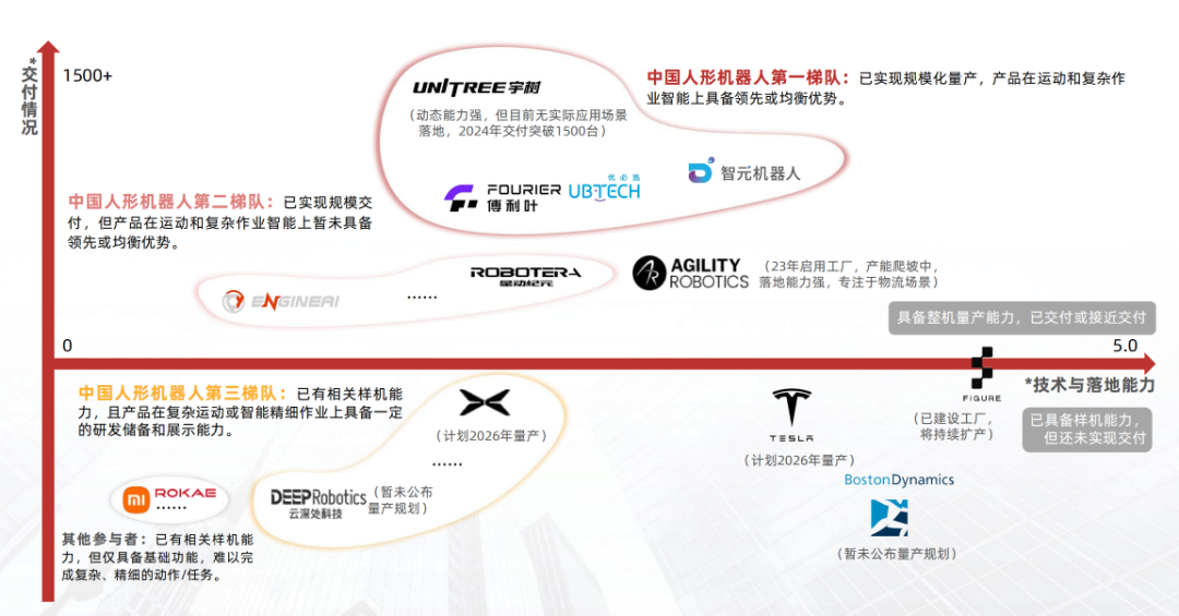 *交付情况:本图仅考虑双足式人形机器人的交付情况,且优先考虑实际交付数量;技术能力:综合从动态运动与平衡、灵巧操作与手部以及应用落地与自主学习等技术维度进行评估,其中应用落地与自主学习的权重最高。
