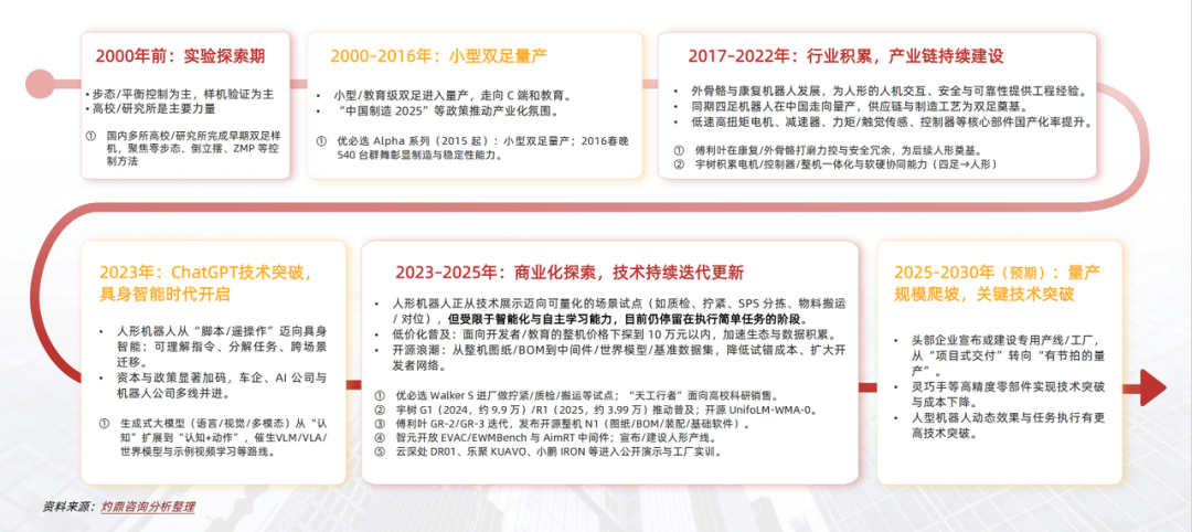 中国人形机器人行业经历实验—量产—积累,目前正处于AI加持的商业化探索关键期。