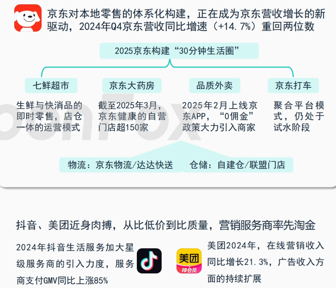 各平台战略持续调整,传统巨头加速创新,淘宝整合即时零售业务,实现多地“30 分钟达”,本地生活 GMV 同比增长;京东物流外部收入占比提升。新势力拓展边界,抖音电商货架模式 GMV 月均增长;小红书强化 UGC 社区,推出“创作者商业服务中心”;闲鱼加速布局线下,新开循环商店,单店月均成交额突破一定数额。