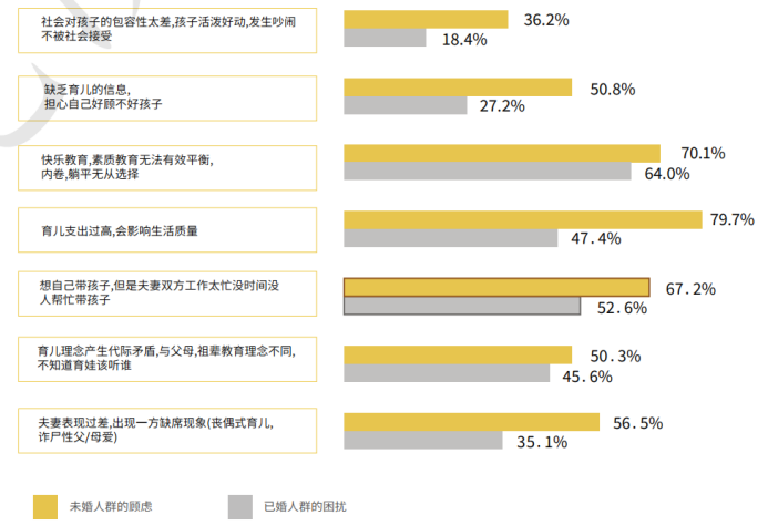 生育问题是女性事业发展面临的一大现实挑战。超过50%的⼥性受访问者认为育⼉和事业发展有冲突,其中未育家庭对此更为担忧。数据从侧⾯证明了由于育⼉的压⼒,⺟亲可能会放弃⼀些对职业发展有帮助的机会,如进修、培训甚⾄晋升等。这种⻓期的职业中断可能导致职业竞争⼒下降,影响⻓期的职业前景。