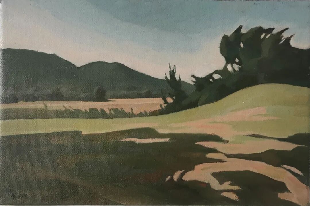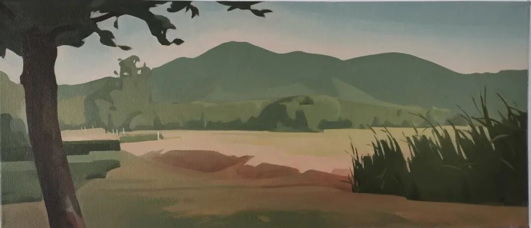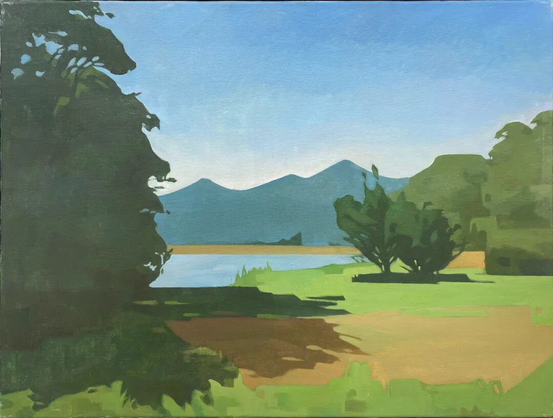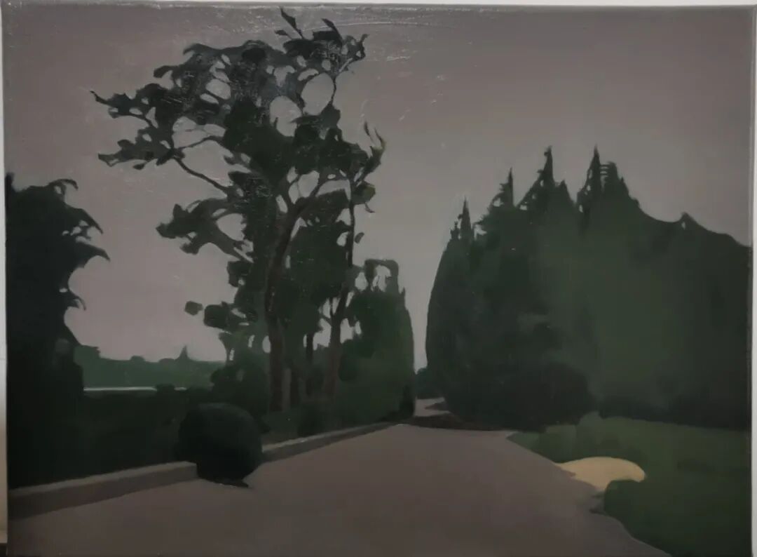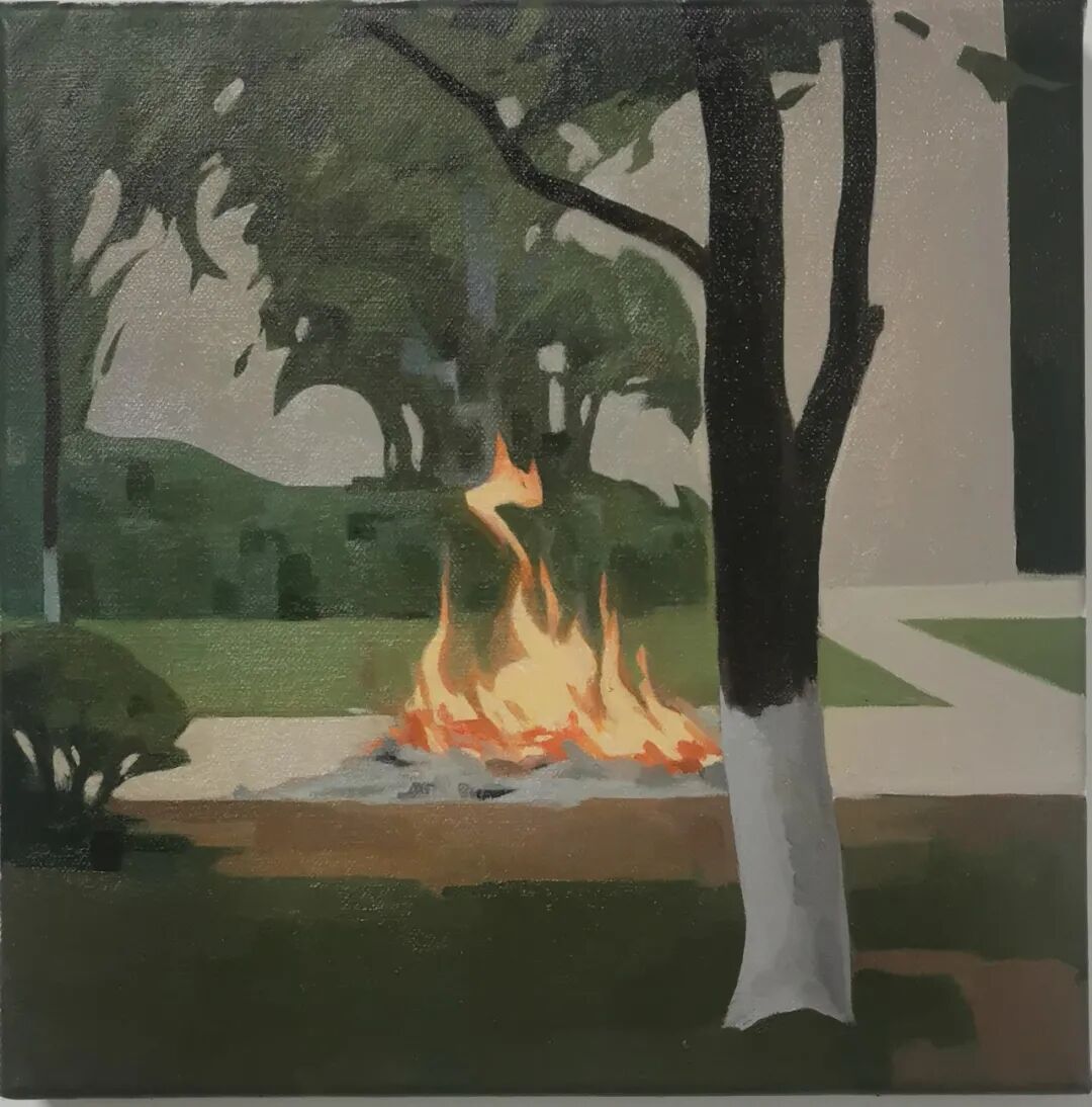 公园里树木被修剪过,留下枝干与切面的疤痕。湖面粼光闪动,反射着阳光,又倒影着山色,印着那青绿的美。公园外在焚烧,柏油路整洁干净,让人不忍踩踏。当然这些画面都被修整过,是李华波用画笔修掉的。原本画面里的人,处于画面中心的事物,在他眼中杂乱的东西,都被修去,留下人为修理过的风景。就像是道路两旁的灌木,园林里的树木,总有园丁去裁撤修剪,但这一切都被他偶然间遇见,并记录了下来。湖面轻动,树叶随风摇曳,这些夜幕下的景色和李华波说话的语调一样,平静并让人安心。
