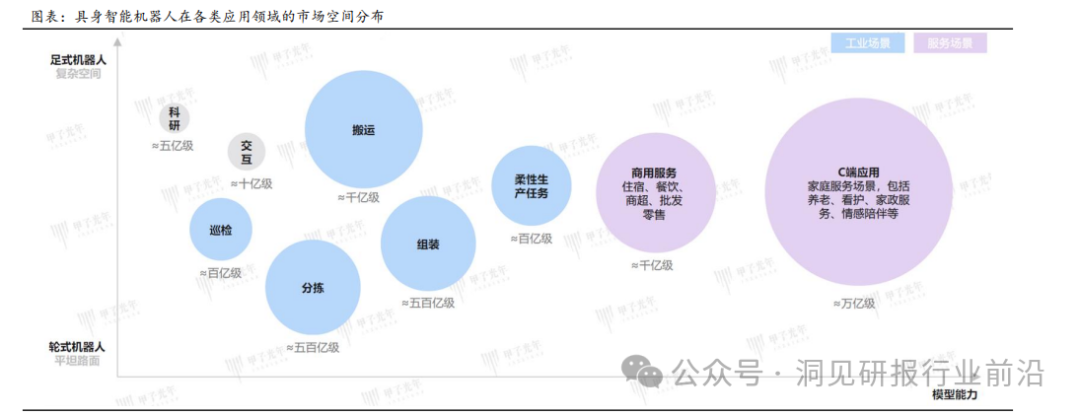 未来,机器人行业将从专用场景向通用场景拓展,从 ToB 市场向 ToC 市场延伸。短期来看,工业制造场景下的任务相对聚焦,对泛化能力要求不高,因此工业制造场景下的任务正在更快进入商业化阶段。在工业制造场景实现商业化落地之后,海量机器人的具身数据叠加算力技术的进步,机器人的能力将循序渐进逐步解锁,并向商用服务、家庭服务等更开放的场景进行延伸。