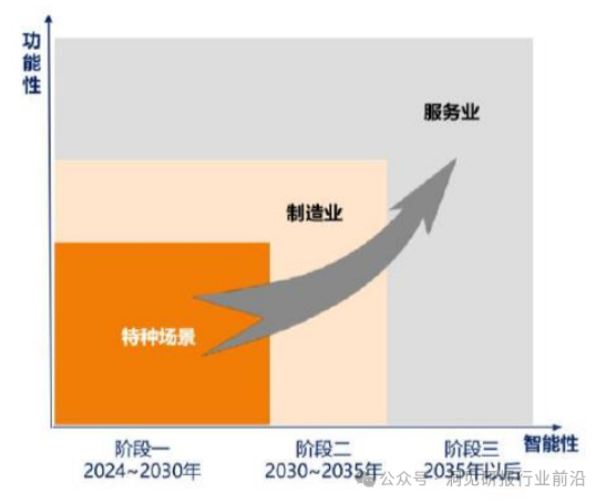 人形机器人商业化落地将分三个阶段进行。第一阶段(2024—2030 年):通过政策牵引,深入挖掘危险作业、极端环境等高价值场景,遴选一批可落地可推广的典型需求。第二阶段(2030—2035 年):加快探索工业制造、物流等制造业相关的大规模应用场景,从“替代相对简单且重复性的劳动”开始,成熟一代应用一代,在迭代中加速技术成熟、降低单体成本、提升整体性能,逐步提高对制造业场景的渗透率。第三阶段(2035 年后):加强人工智能与人形机器人的融合创新,实现更高水平的具身智能,并推动人形机器人进入医院、学校、商场、餐厅等服务业场景,最终走入千家万户。