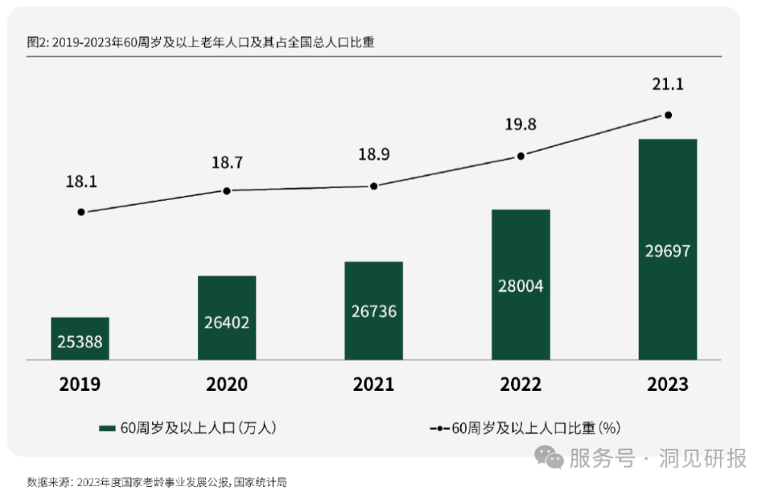 2024年10月,民政部、全国老龄办发布《2023年度国家老龄事业发展公报》,截至2023年末,全国60周岁及以上老年人口29697万人,占总人口的21.1%;全国65周岁及以上老年人口21676万人,占总人口的15.4%。预计在2035年,60周岁及以上人口将继续上涨至全国总人口的30%,达到4亿人口规模。