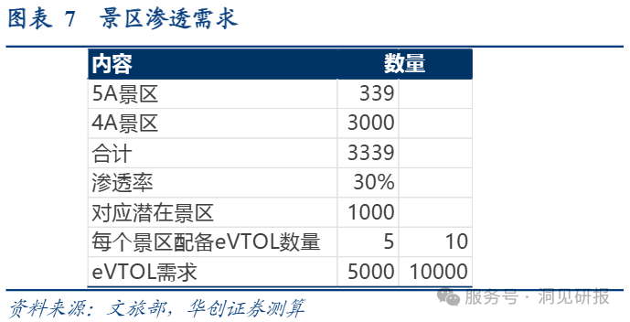 据华创证券预计,文旅市场是其可率先落地商业化的重要场景。预计到2027年,有30%的4A级以上景区引入 eVTOL低空游览,共计5000-10000架的需求量。