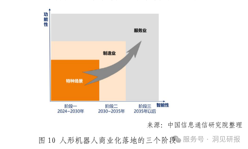 随着人形机器人的大量生产,各行业也在推动人形机器人实现商业化落地。据中国信息通信研究院报告,该过程分为三个阶段,To B 市场是人形机器人发展的必经阶段,To C 市场将成为远期重点方向。