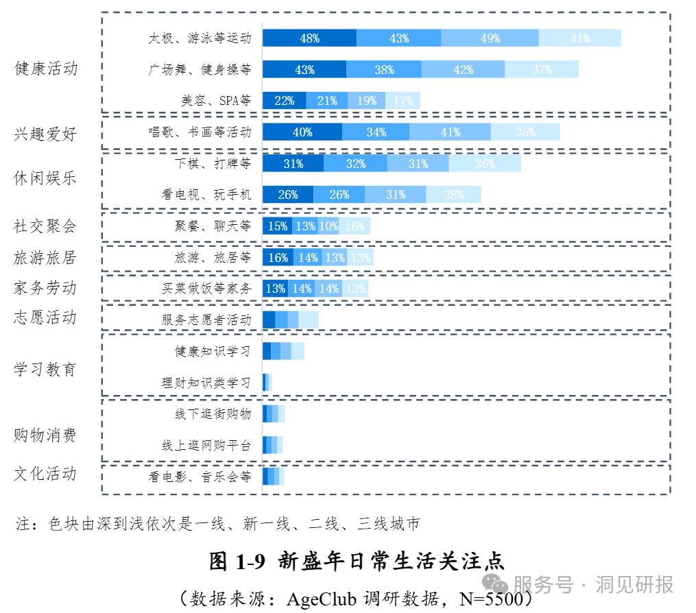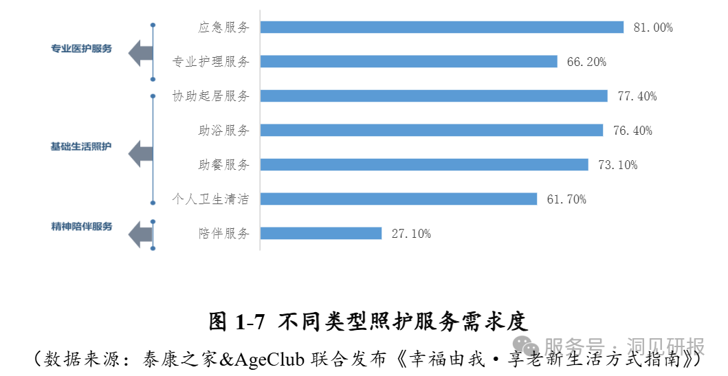相关数据显示,新高龄群体(75+岁)更需要生活照护和医疗服务,其中应急服务(81.0%)、协助起居服务(77.4%)、助浴服务(76.4%)排名前三;新盛年群体(60-74 岁)对慢病管理和社交文娱的需求更高。