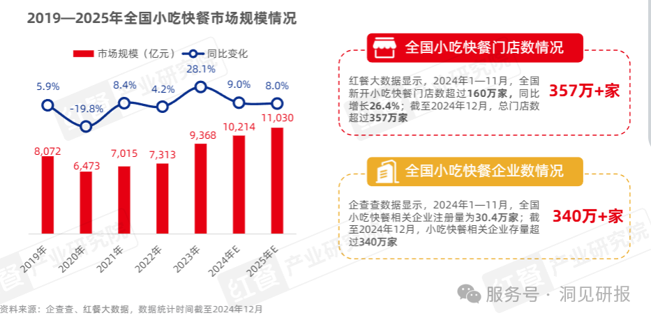 小吃快餐刚需属性强,受众人群广,截至2024年12月,全国总门店数已超过了357万家,预计2024年小吃快餐市场规模将突破1万亿元。