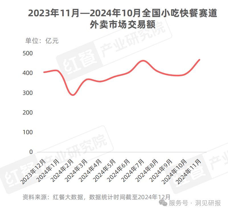 外卖服务的便捷性和高效性推动了小吃快餐外卖市场的持续增长。红餐大数据显示, 2023年12月至2024年11月,小吃快餐赛道的外卖市场交易总额超过4,700亿元,占小吃快餐赛道市场规模的46.5%。