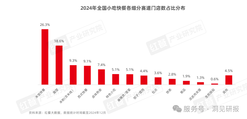 快捷、平价、现炒快餐更受年轻人群的喜爱,2024年全国小吃快餐细分赛道门店中米饭快餐以26.3%的高额市场占比断崖领先,证明了消费者们对于该品类的认可程度。