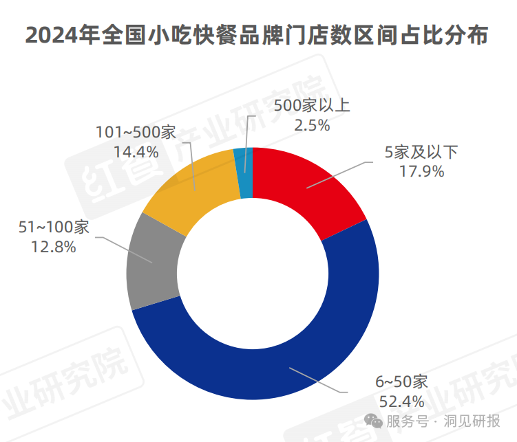 由于投资模式相对轻,小吃快餐赛道吸引了大量创业者涌入,中小规模的品牌数占比呈现上升趋势。截至2024年12月,门店数在50家及以下的品牌数占比达到70.3%,比2023年年底提升了1个百分点。