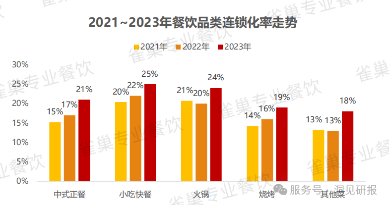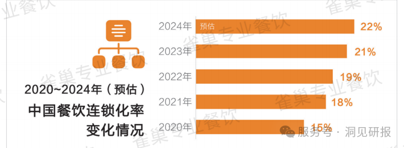 近年来,中国餐饮连锁化率从2020年的15%,提高到2023年的21%,预计2024年连锁化率将达22%,预示着中国餐饮进一步向“品牌化、规模化、连锁化”的方向发展。