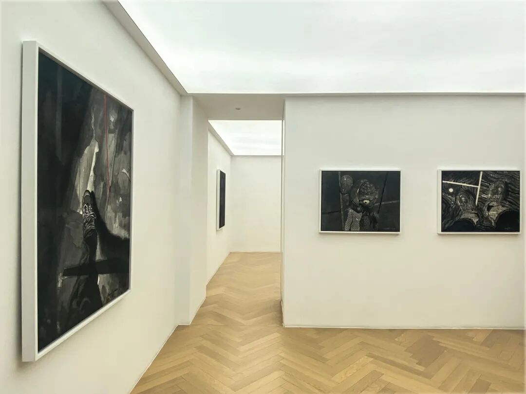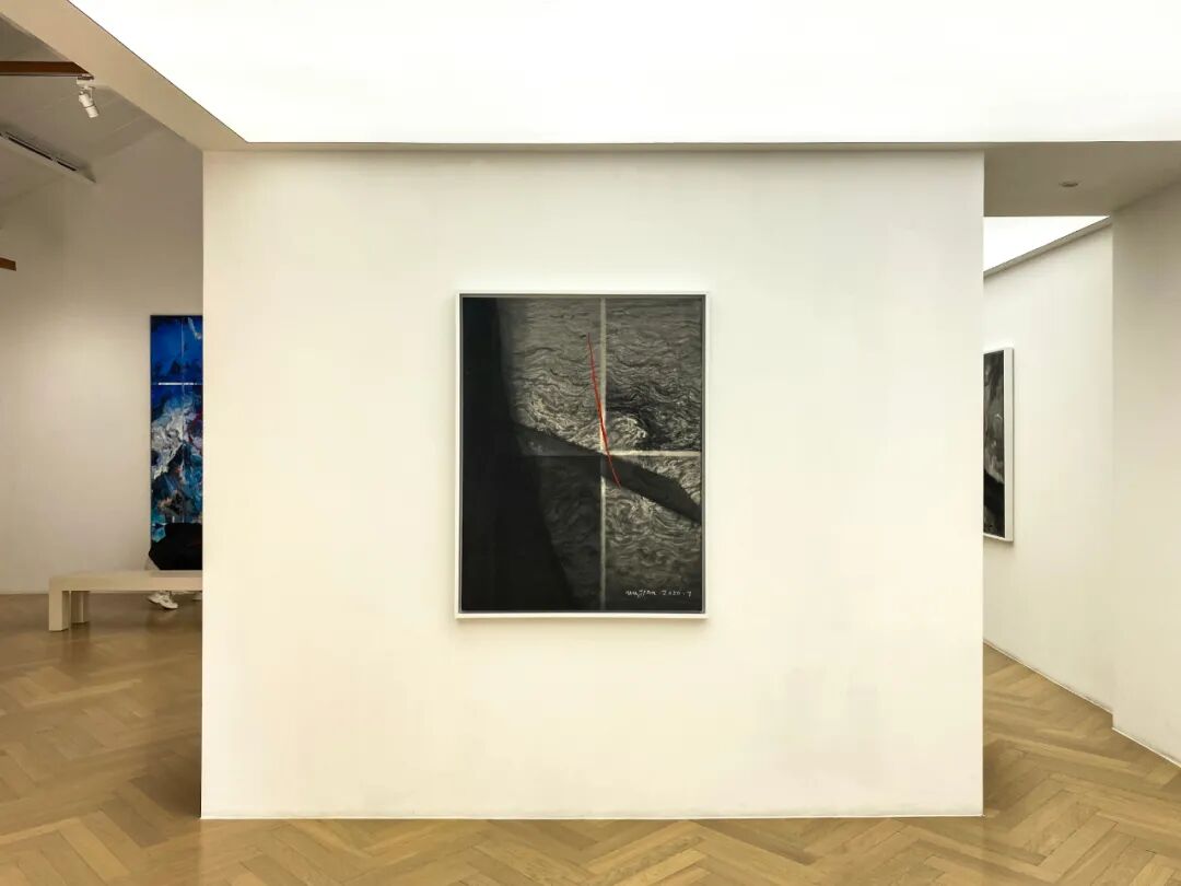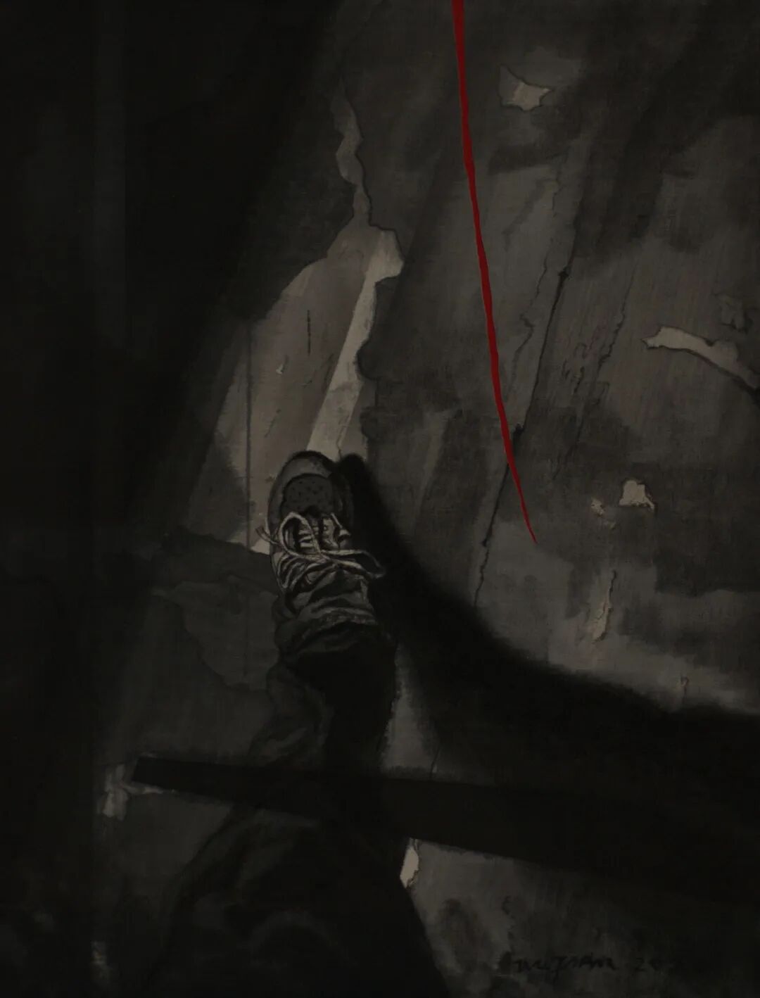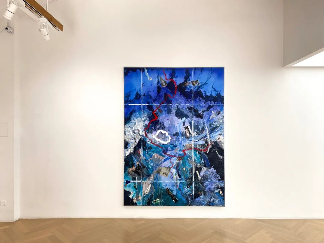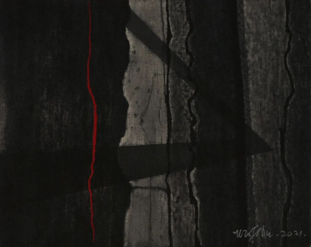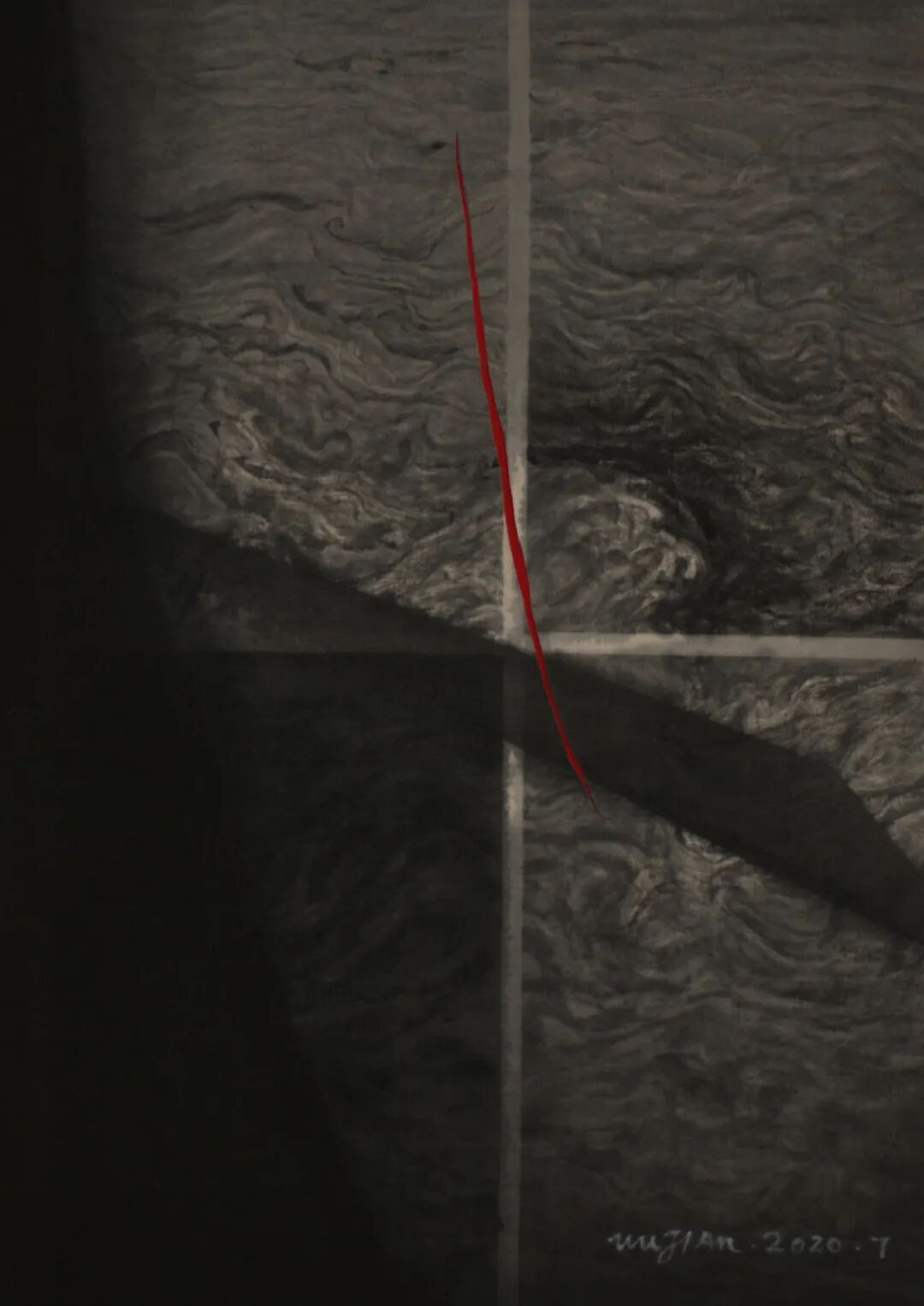 在近期的创作中,吴翦将画布剪开,再重新将其缝合。这只是一种印记,在他黑白灰为主题的画上,红色有如裸露在外的肌肉、血管、甚至是脏器,就好像是一场医学手术后留下的缝合线,留下的无法复原的疤痕。看见红线,盐田千春的名字就出现在我的脑海,我看到她作品,甚至是可以触摸得到的。那红线就像是毛细血管,犹如连着心脏,而她用红色的线去连接个人情感表达,也是联系所有关系的纽带。吴翦的红线也给我一种在维系,在修复的感觉,就好像是撕裂的情感,但又难以割舍。这不正是我们每个人经常会遇到的吗?