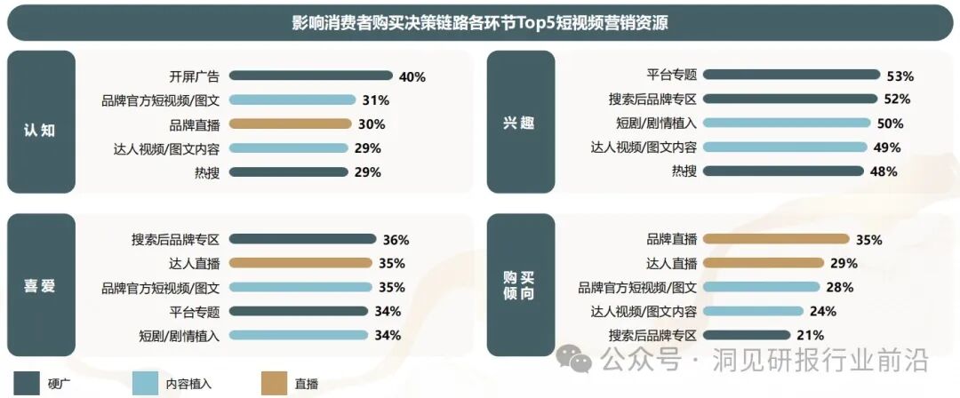 在消费者认知与兴趣阶段,硬广(开屏、平台专题以及品专)触达效率更高。而在购买链路后半段的喜爱与购买意向环节,形式更丰富的直播、短视频、图文重要性凸显。